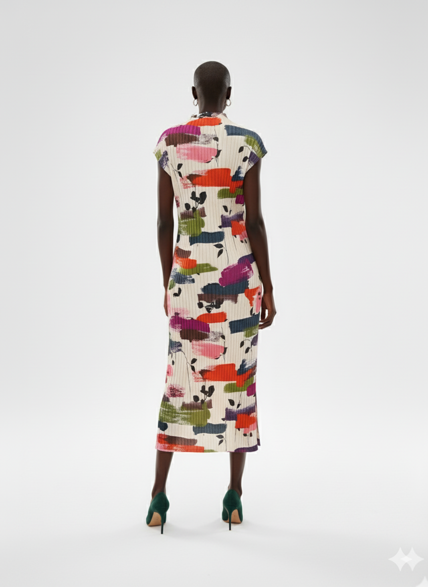 This dress stands out with its dynamic abstract print, featuring bold, broad brushstrokes in a rich palette of pinks, oranges, greens, purples, and blues, interspersed with delicate leaf or floral outlines. The pattern is set upon a light, creamy background. The entire garment is covered in fine vertical micro-pleats, which create beautiful dimension and fluidity. A simple mock neckline and neat cap sleeves keep the silhouette refined and modern, allowing the print and texture to truly shine.