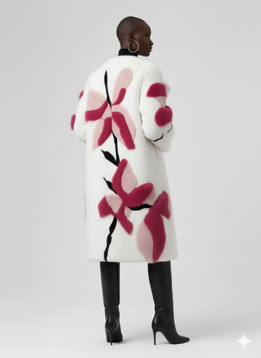 This extraordinary coat features a captivating abstract patchwork design in a vibrant palette. Dominantly set against a soft ivory/white faux fur base, the coat is adorned with irregularly shaped patches and strips in striking hot pink/fuchsia, softer blush pink, classic black, and hints of deep emerald green. The texture varies between the patches, creating a rich visual and tactile experience. The silhouette is a comfortable, slightly oversized longline cut with a clean, collarless neckline, allowing the artistic pattern to be the undisputed focal point.