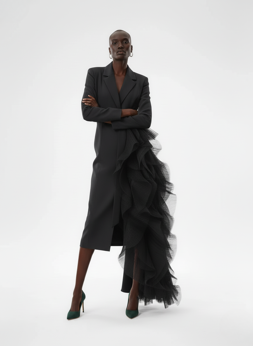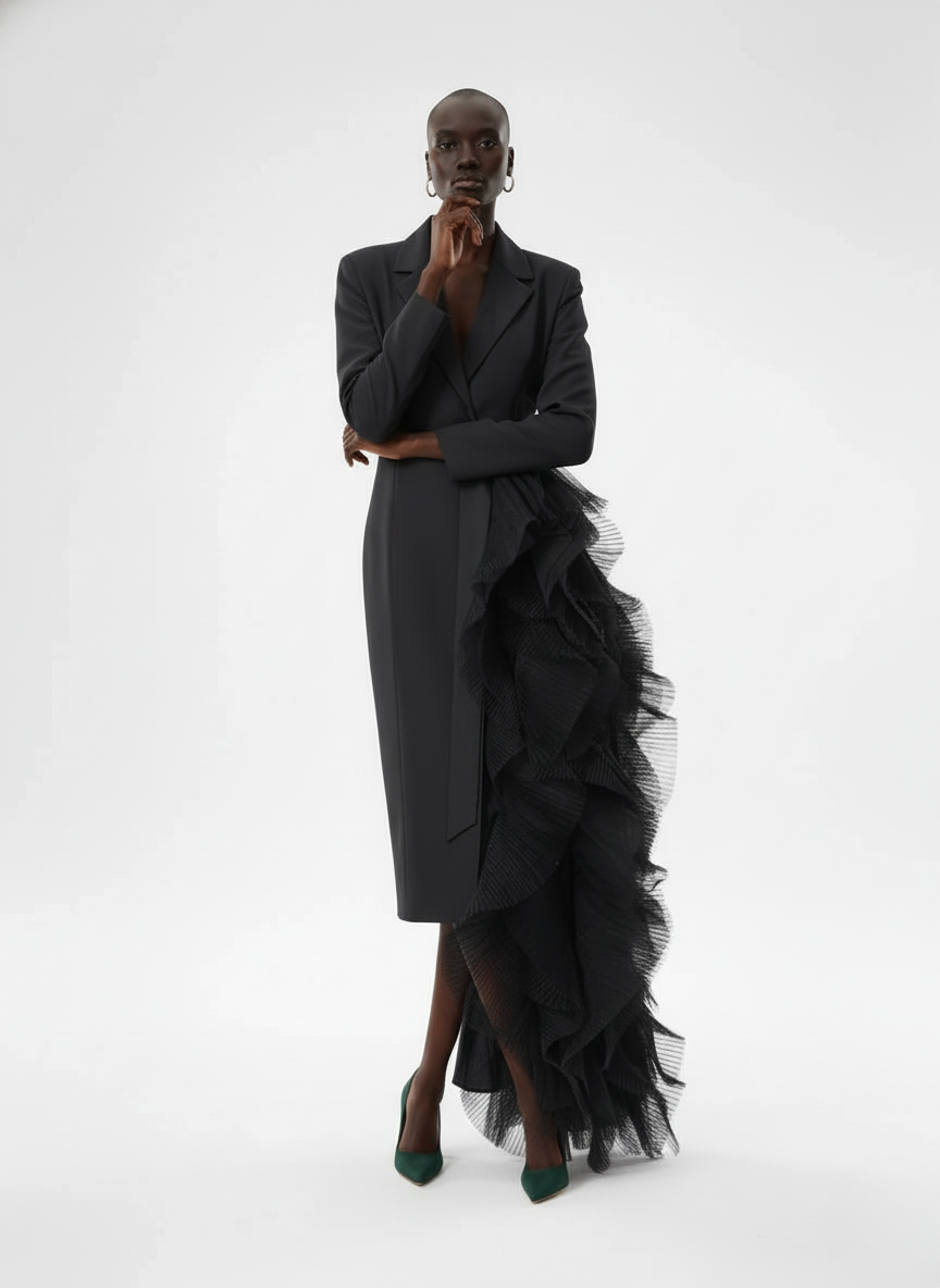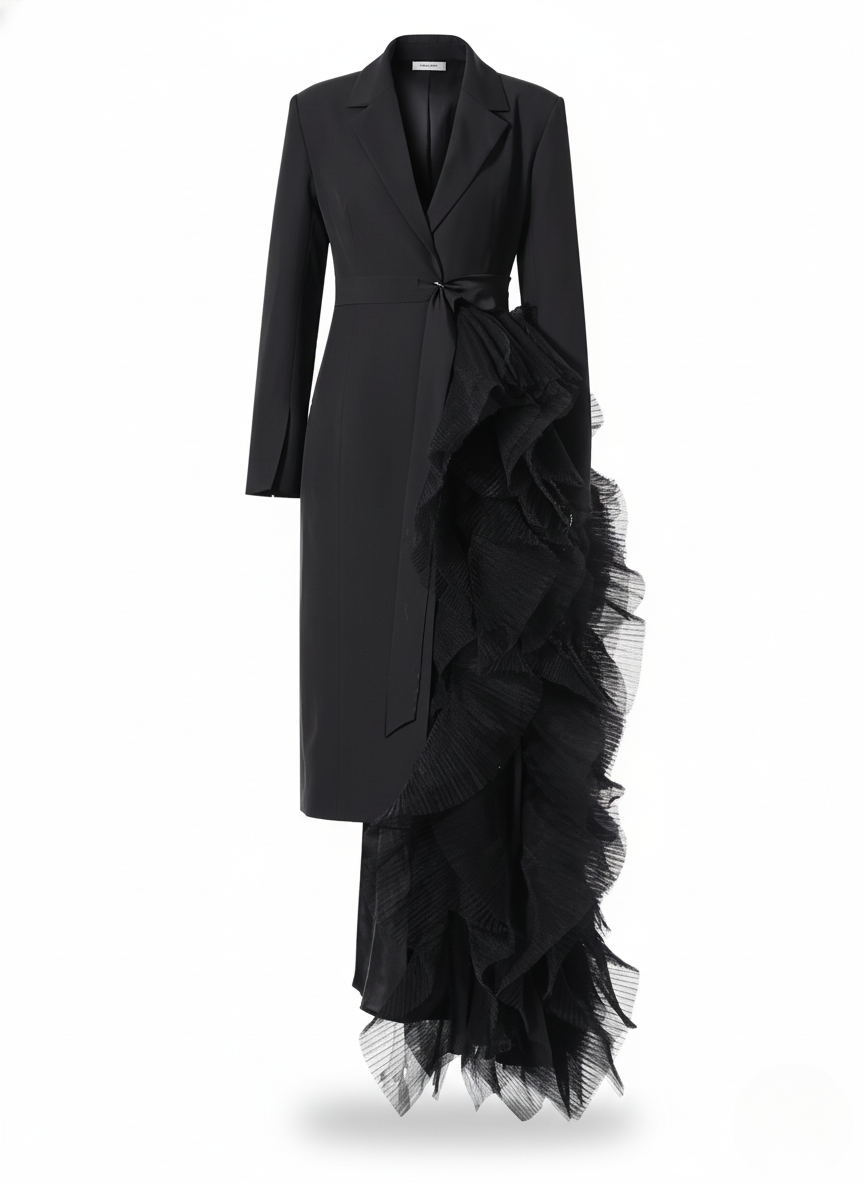 Pair this exquisite coat dress with sleek ankle boots and a tailored tote for a polished office look, or style it with statement earrings and heeled sandals for evening engagements. For a more relaxed vibe, layer it over a fitted turtleneck and wide-leg trousers. The Asymmetric Ruffle Cascade Coat Dress is your new go-to for showcasing a confident, globally-inspired aesthetic.