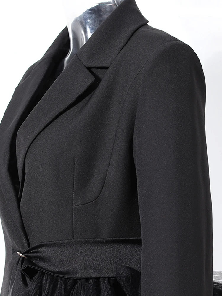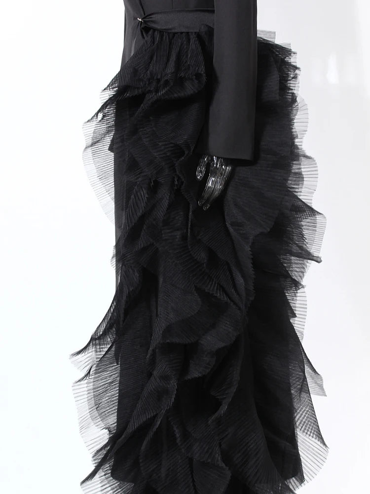 This coat dress features a striking asymmetric silhouette, artfully adorned with ruffle cascades that drape gracefully down the front. The notched collar and single-breasted closure lend a refined touch, while the generous pockets add a practical element to this formal yet versatile piece. Its solid black hue offers endless styling possibilities, effortlessly transitioning from day to night.