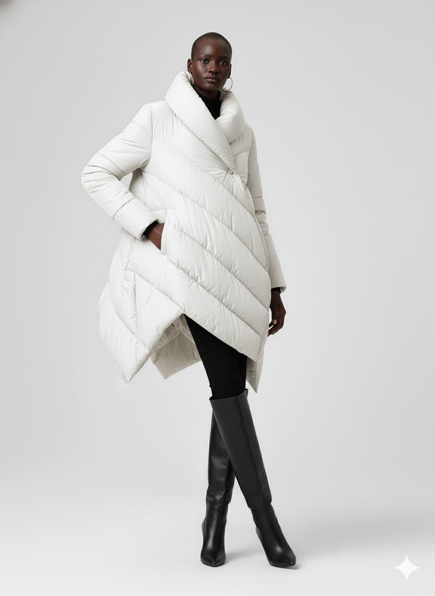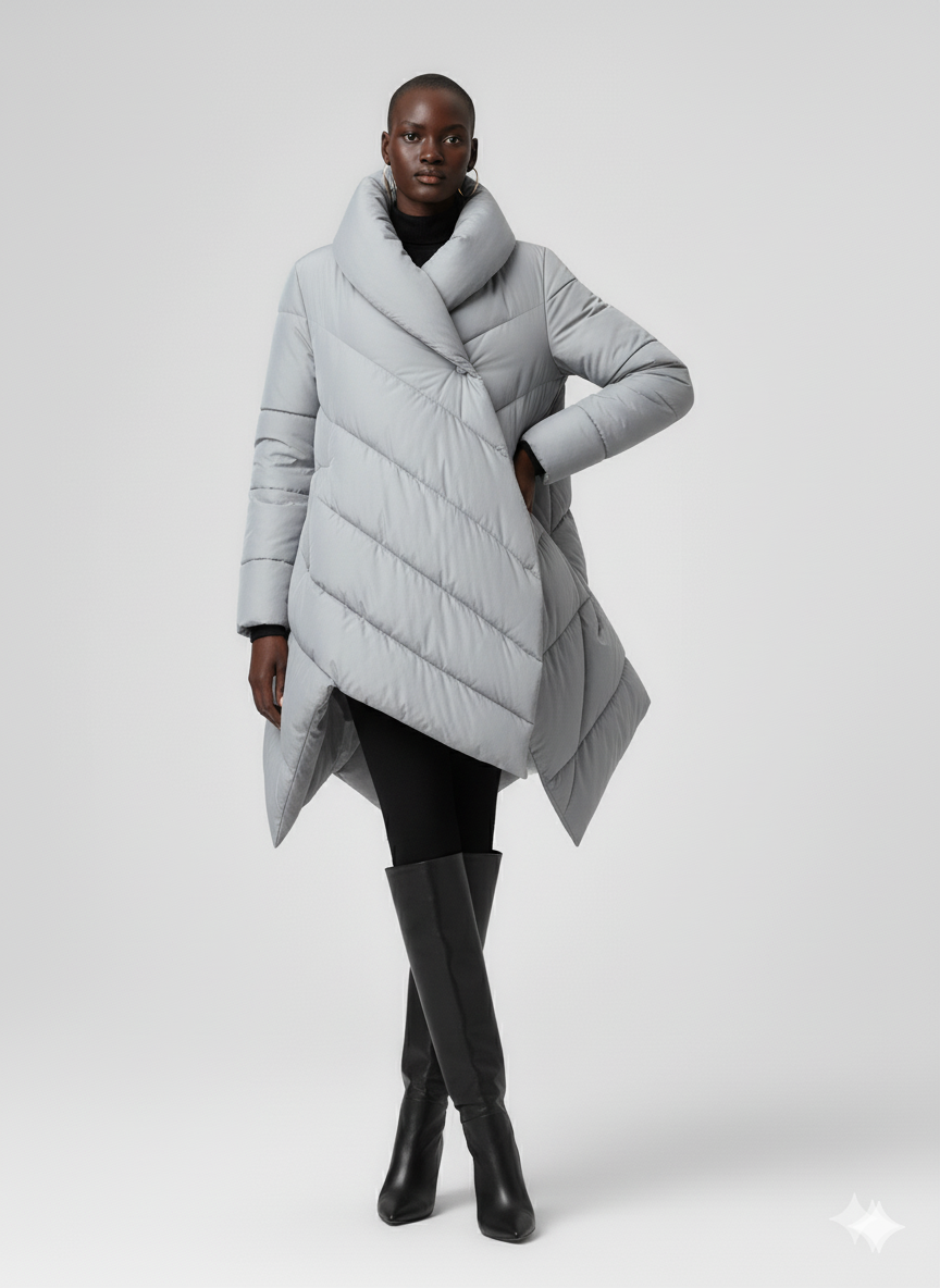 Embrace sophisticated warmth with the Asymmetrical Hooded Puffer Coat, a modern take on winter outerwear. This coat offers an artistic blend of comfort and avant-garde design, providing exceptional insulation against the cold while showcasing a distinctive, flowing silhouette. Its unique shape ensures maximum coziness and effortless elegance, making it an indispensable piece for the colder months.
