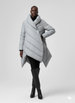This statement puffer coat features a captivating asymmetrical cut that drapes beautifully, creating a dynamic and voluminous silhouette. The design is highlighted by a dramatically oversized, integrated hood that acts as a plush collar when down, offering both warmth and a chic frame for the face. The hidden snap-front closure maintains clean lines, while the wide, generous sleeves contribute to its cocoon-like comfort. The hemline sweeps longer on one side, adding an artistic, contemporary edge to this effortlessly stylish piece.