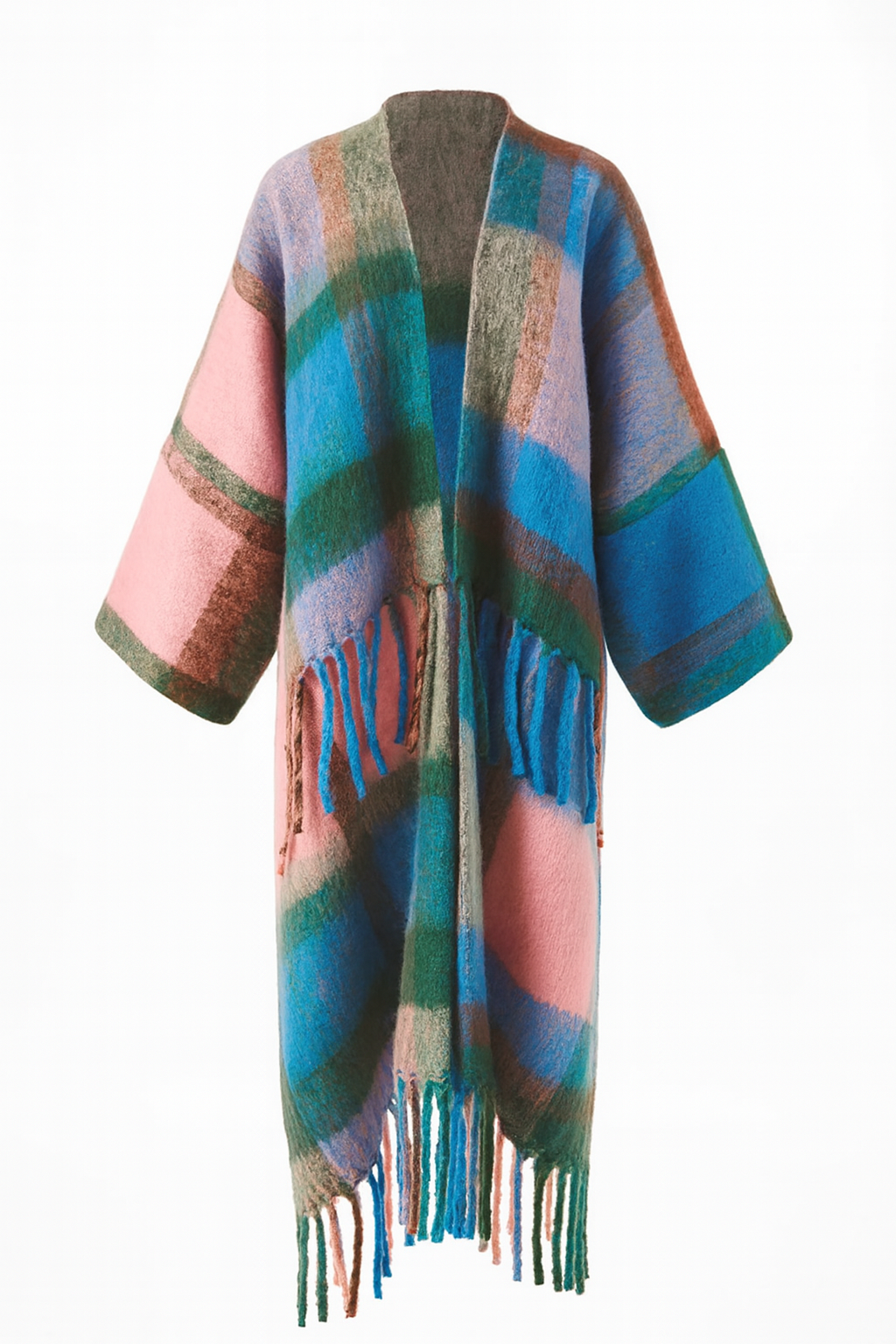Blending African-inspired plaid patterns with modern elegance, this WINYI winter kimono coat redefines seasonal sophistication. Designed in a longline silhouette (26+ inches) with a flattering V-neck, it features an open-stitch closure and loose fit for effortless layering. The geometric plaid print adds visual richness, while vintage-inspired tassel detailing enhances its bohemian charm. A versatile piece that combines comfort, modesty, and global flair.