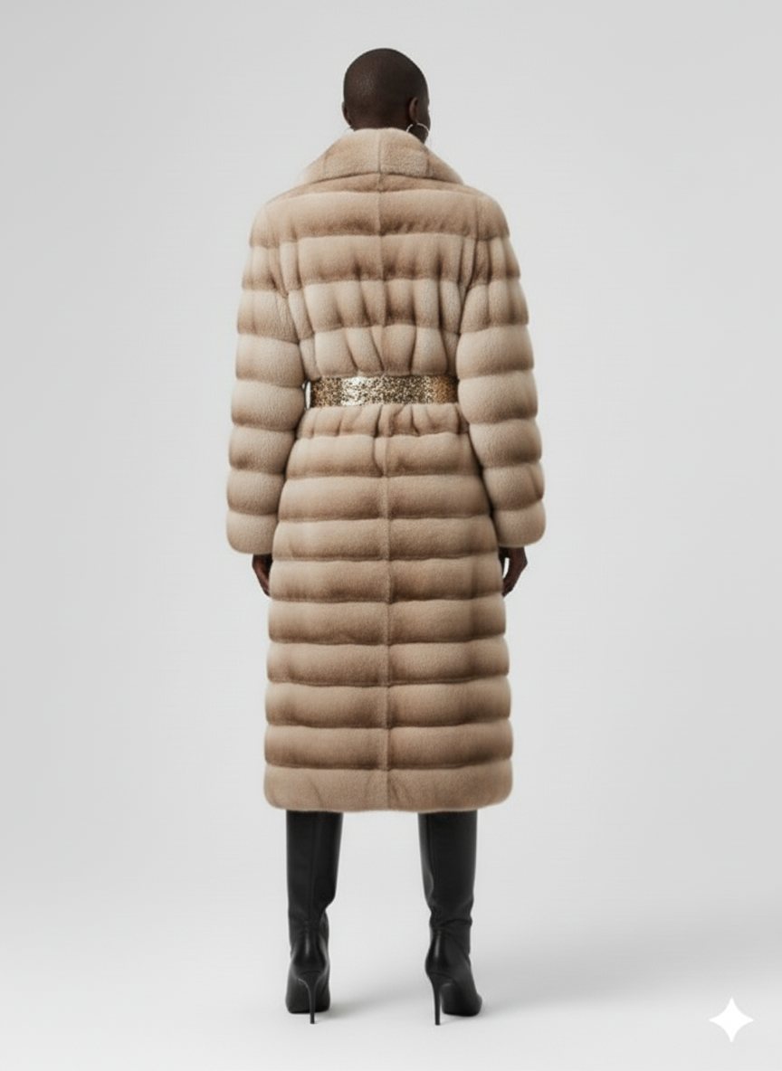 Indulge in timeless luxury with the Champagne Veil Faux Fur Coat. This exquisite long-line duster coat features a voluminous, soft faux fur crafted into striking horizontal ribbed panels that run from the collar to the hem, creating a lush, textured silhouette. The coat's sophisticated neutral color palette—a blend of beige, cream, and subtle taupe—mimics the look of fine chinchilla fur, offering unparalleled glamour. Cinch your waist with the matching thick self-tie belt for a flattering shape, or wear it open for a dramatic, flowing look.