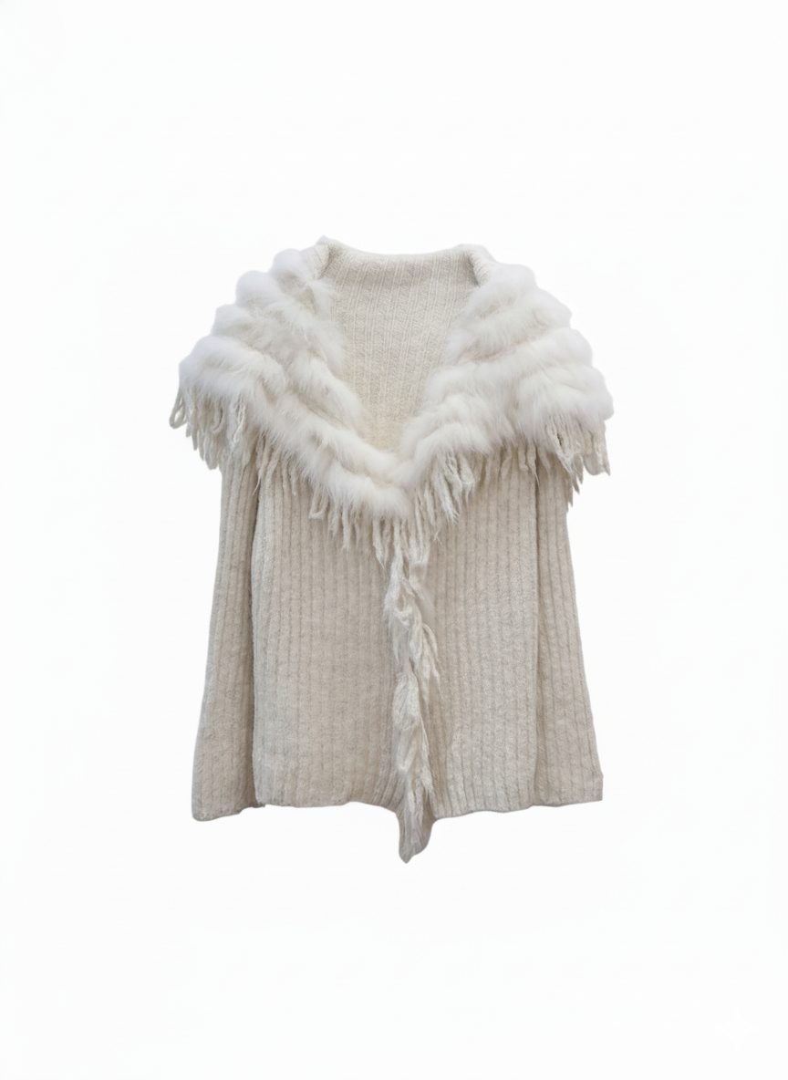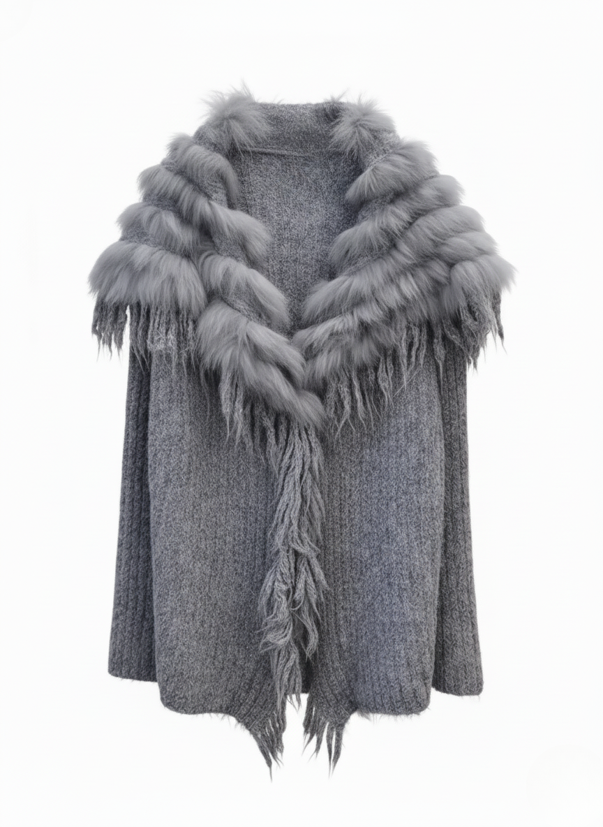 With its loose-fitting silhouette and refined V-neck, this cardigan offers an effortless grace that enhances any outfit. The subtle faux fur trim adds a touch of opulence, while the muted gray beige hue exudes versatility, allowing for seamless integration into a variety of wardrobes. Full sleeves with raglan detailing reflect a relaxed yet polished aesthetic, inviting confidence with every wear.