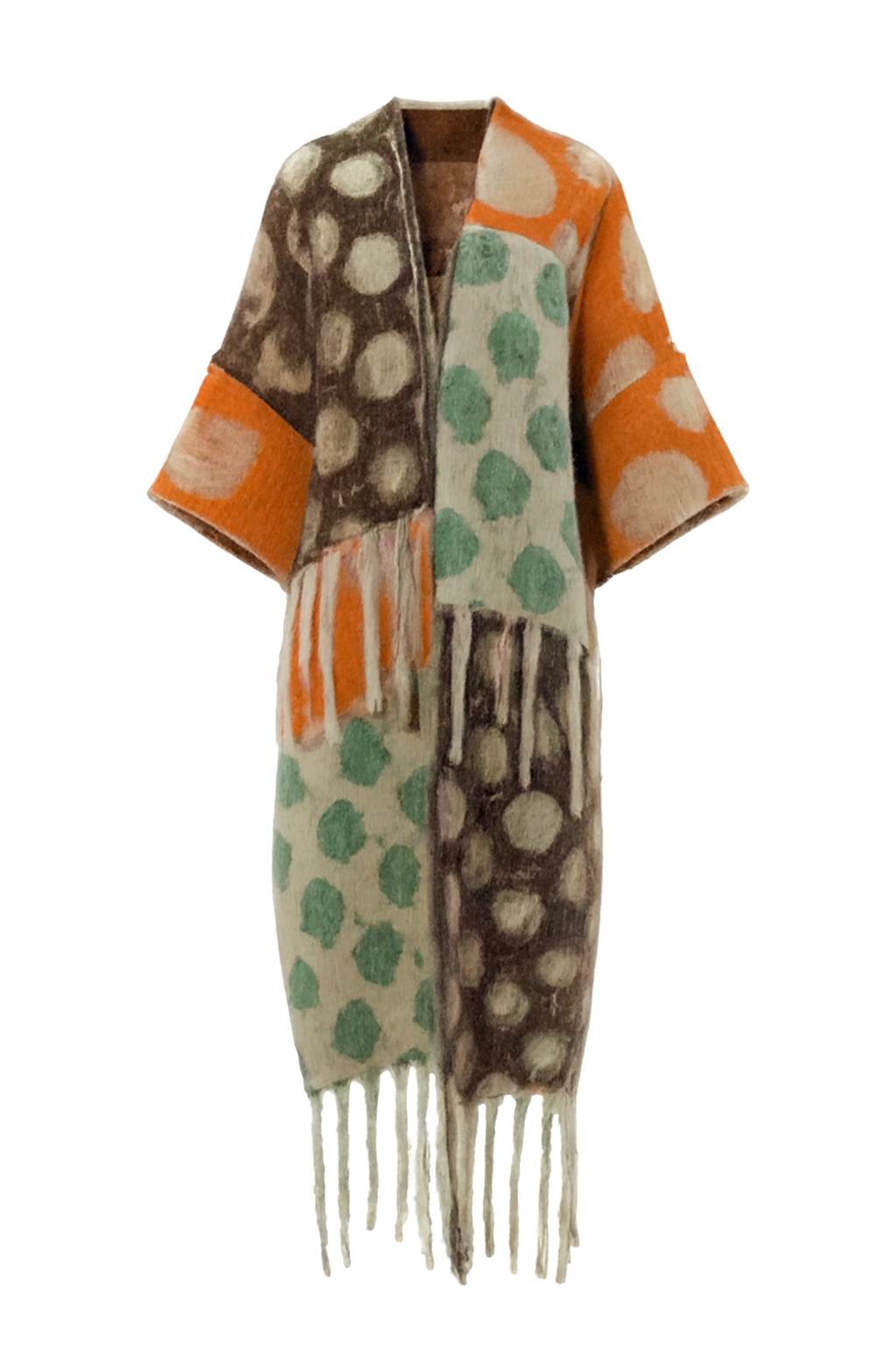 Pair this elegant coat with a bohemian-inspired dress for a chic winter look, or wear it over tailored pants for a more refined ensemble. The circle print and tassels make it a standout piece for evening events or casual outings, ensuring you stay stylish and warm throughout the winter season.