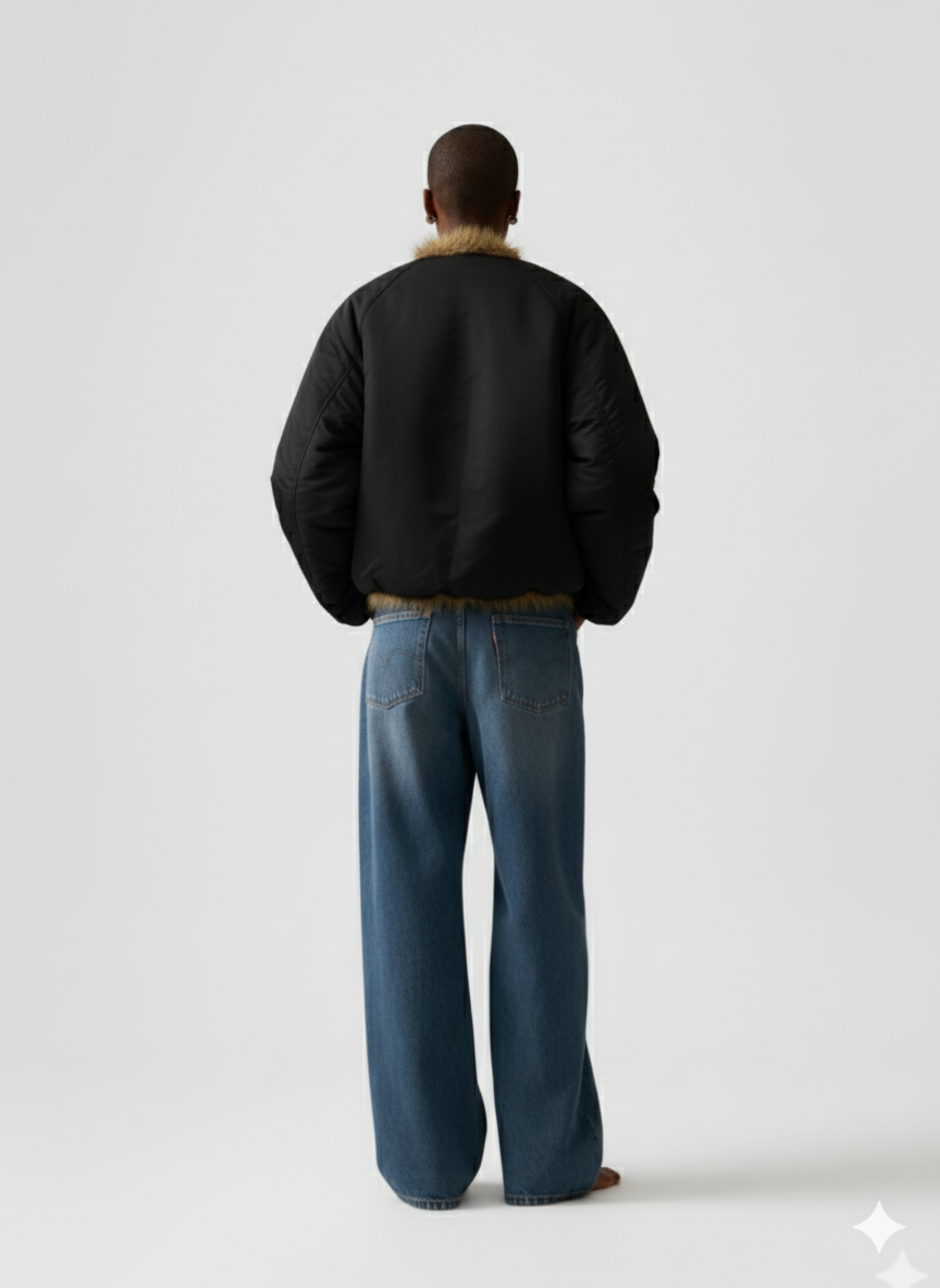 This bomber jacket stands out with its fully reversible design, offering two distinct looks in one garment. One side features a matte black nylon shell with a clean, collarless V-neckline, offering a sophisticated, streamlined profile. The reverse side boasts a plush, shaggy faux fur in a rich, multi-tonal brown/gold hue, turning the jacket into a cozy statement coat. The oversized fit and dropped shoulder create a modern, voluminous drape, while the ribbed cuffs are replaced with an adjustable toggle detail on the lower hem, enhancing its unique aesthetic.