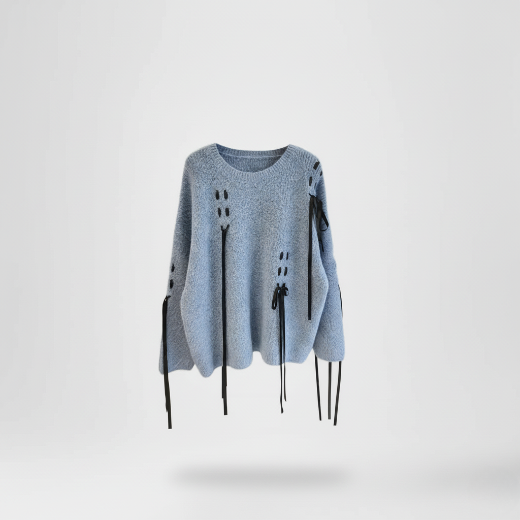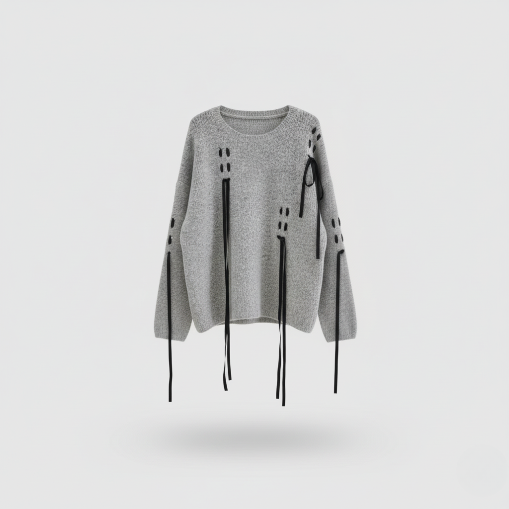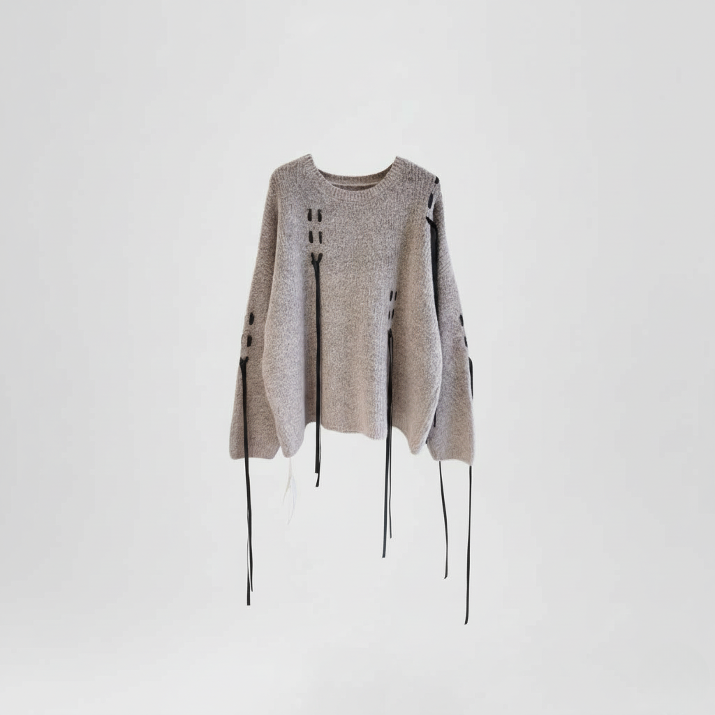 The silhouette of the Ribbon Trail Statement Knit captures attention with its loose-fitting nature, perfect for a graceful drape against your silhouette. The O-neck collar and lace-up details infuse the design with a hint of artistry, while the full-length sleeves transition smoothly from day to night. Offered in a classic solid color, this piece stands as a testament to understated glamour.
