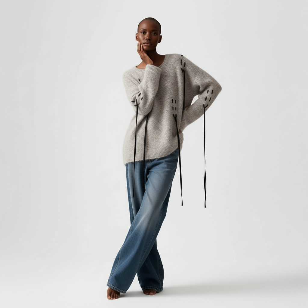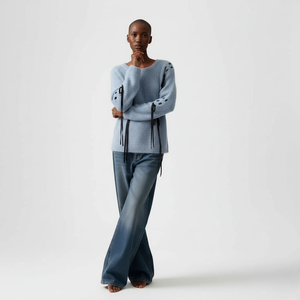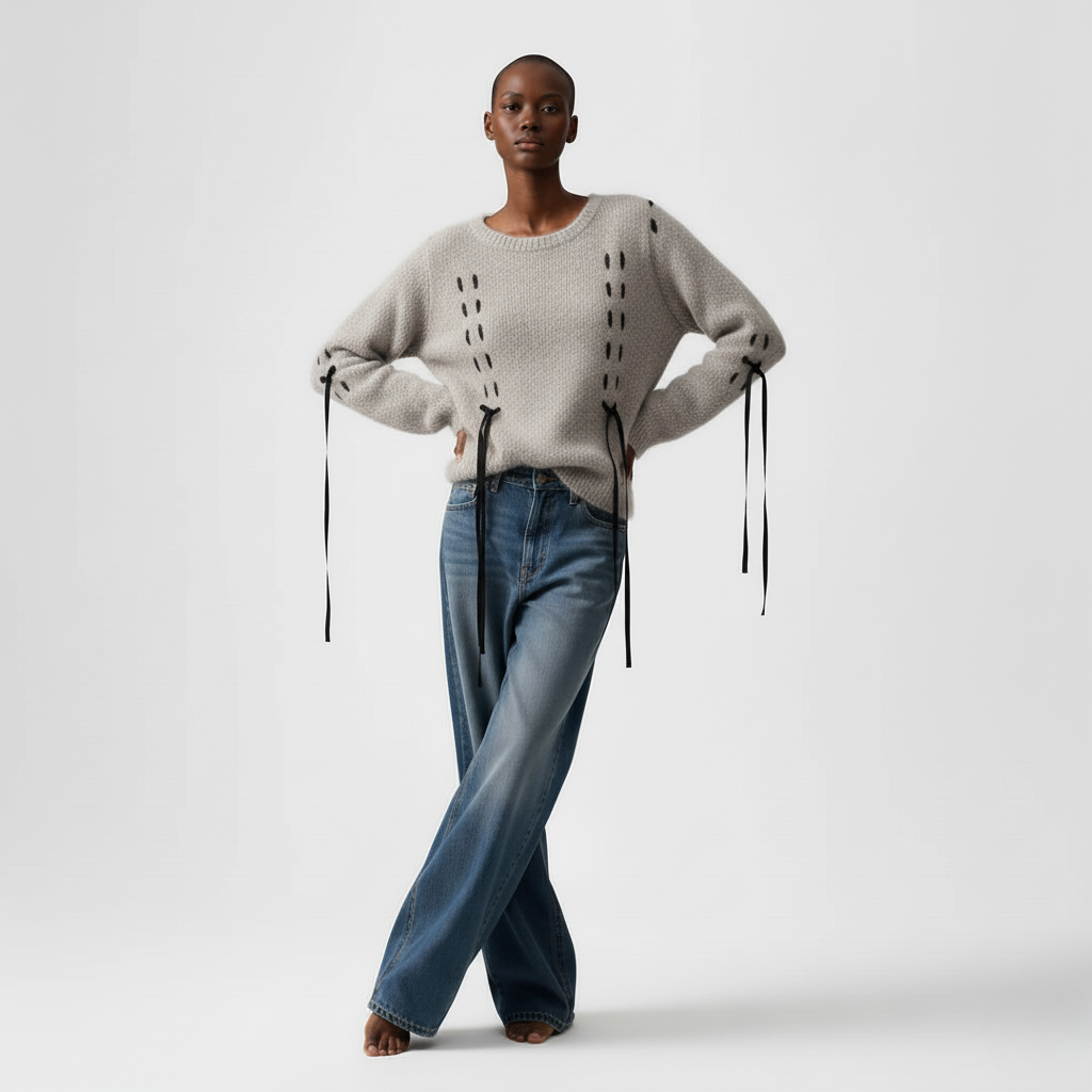 The silhouette of the Ribbon Trail Statement Knit captures attention with its loose-fitting nature, perfect for a graceful drape against your silhouette. The O-neck collar and lace-up details infuse the design with a hint of artistry, while the full-length sleeves transition smoothly from day to night. Offered in a classic solid color, this piece stands as a testament to understated glamour.