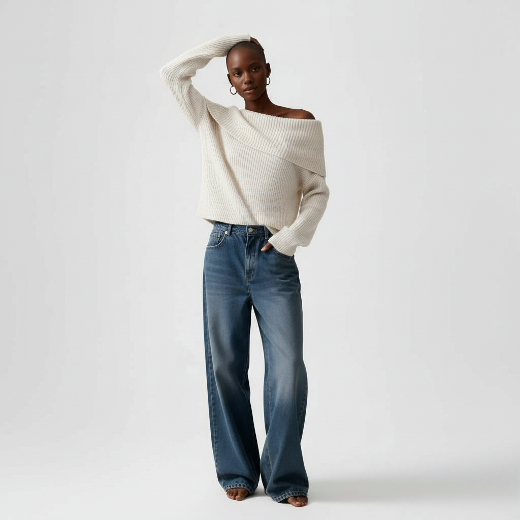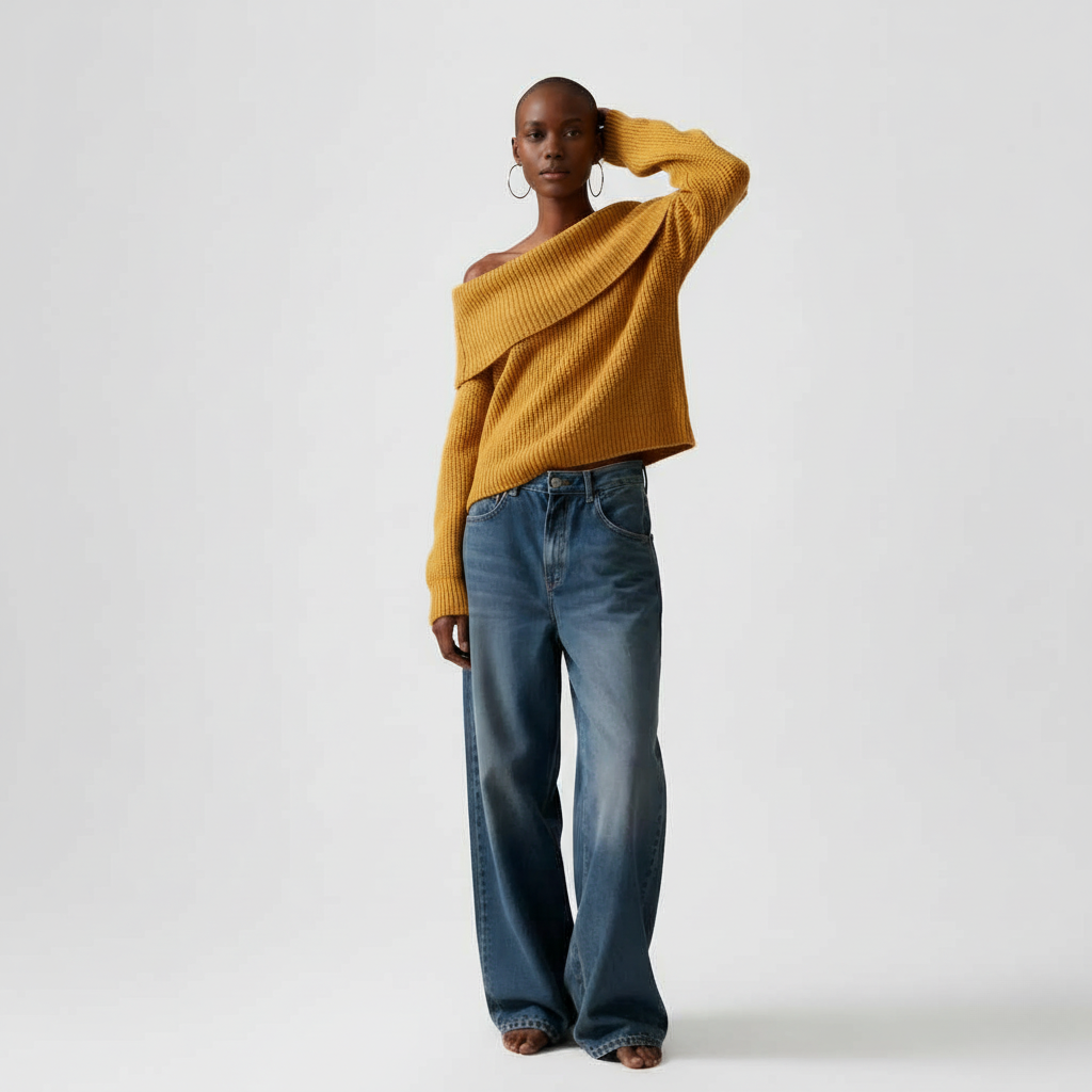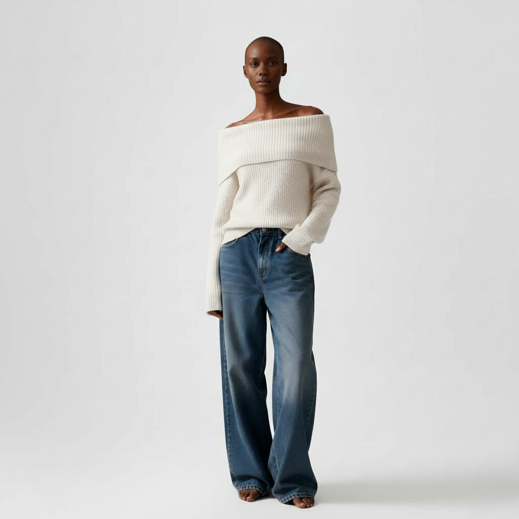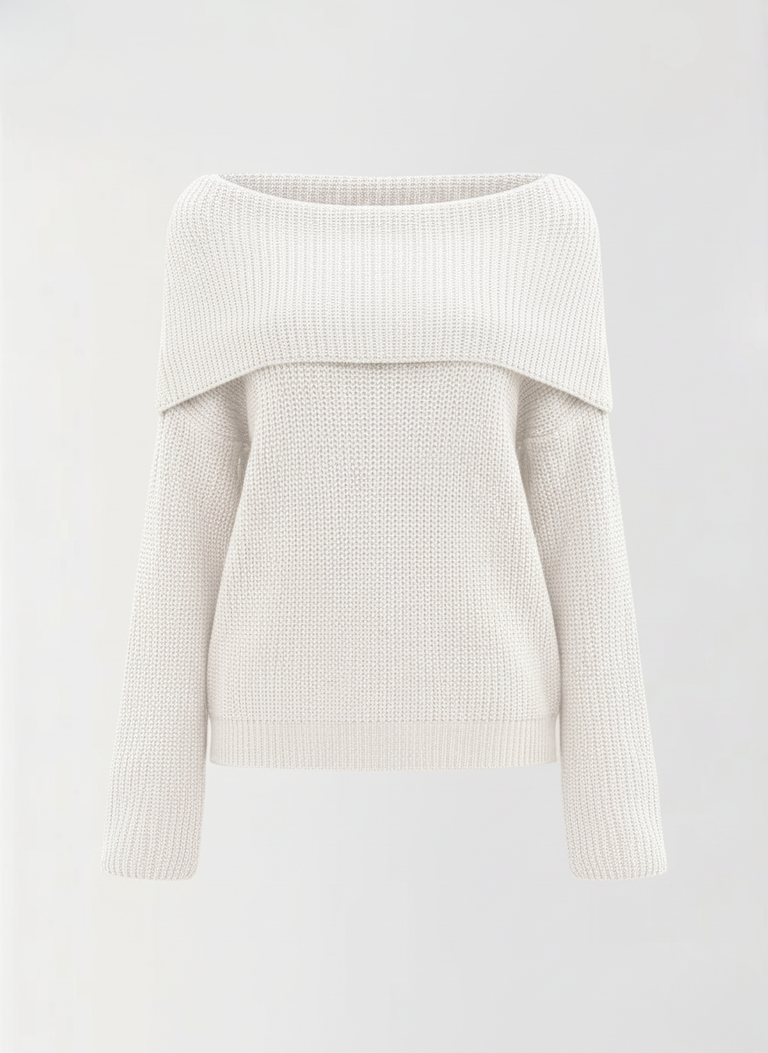 For an effortlessly chic street style, pair this knit with high-waisted jeans and ankle boots, or layer it over a sleek skirt for an elevated evening look. Accessorize with statement jewelry and a crossbody bag for a touch of sophistication. Whether you're meandering through the city or gathering with friends, this off-shoulder knit is a quintessential addition to your wardrobe, embodying a spirit of timeless grace and contemporary flair.