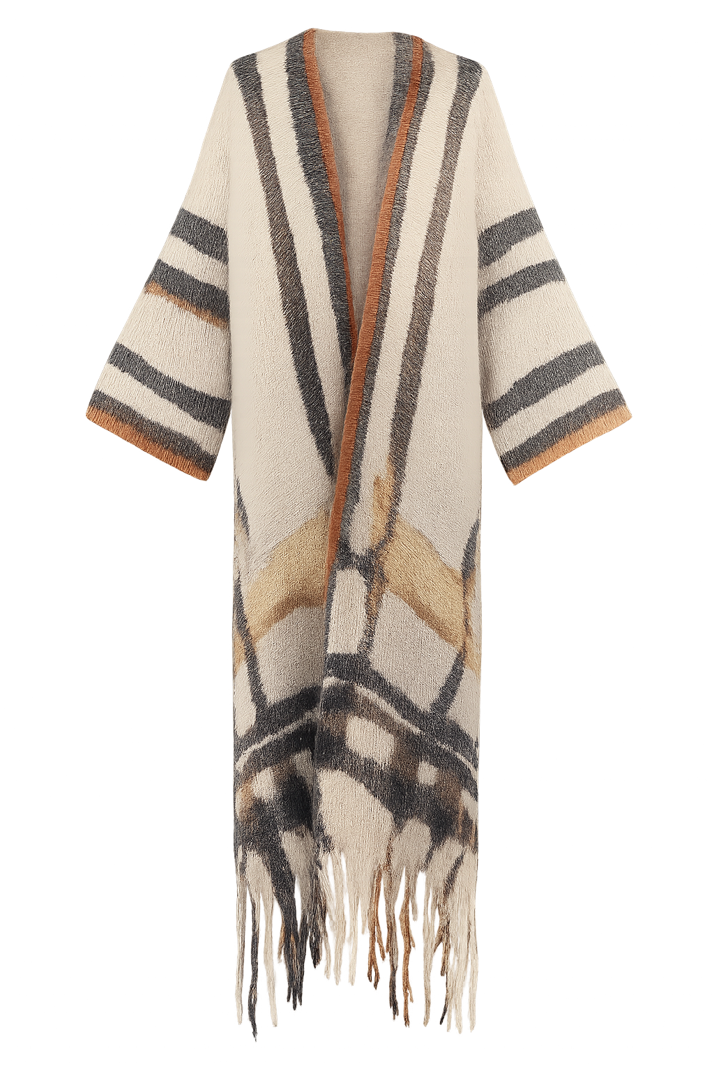 Elevate your wardrobe with the Sahara Lines Kimono, crafted for timeless style and versatile layering. Featuring a refined plaid pattern and delicately finished fringed edges, this cardigan offers both visual interest and sophisticated texture. Its comfortable fit and quality materials make it ideal for adding warmth without bulk, perfect for transitioning between seasons or enhancing any ensemble with a polished yet relaxed touch.