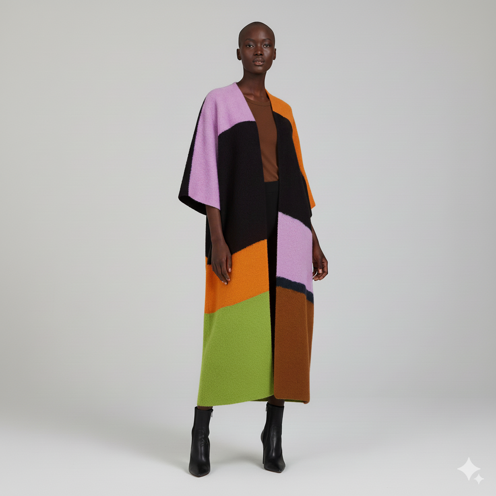 Perfect for winter outings, holiday occasions, and cultural events, this coat transitions effortlessly from casual chic to evening elegance. Pair it with slim trousers and boots for a modern city look, or wear it draped over a maxi dress for a modest yet stylish ensemble. Its geometric print makes it a striking centerpiece, while the neutral tones allow easy pairing with both bold and minimal accessories.