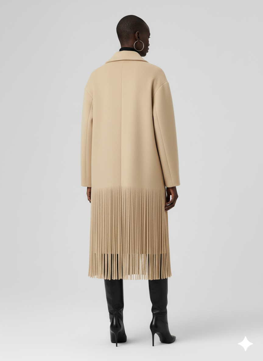 Crafted from a medium-weight, structured polyester-wool blend (or similar quality material) that holds its shape beautifully while offering warmth and drape. The long, densely-packed tassel fringe is seamlessly integrated into the hemline, providing a spectacular, weighted movement as you walk. The front closure is clean and minimalist, likely featuring a single hidden button or hook-and-eye, allowing the coat's uninterrupted lines and dramatic fringe to take center stage.