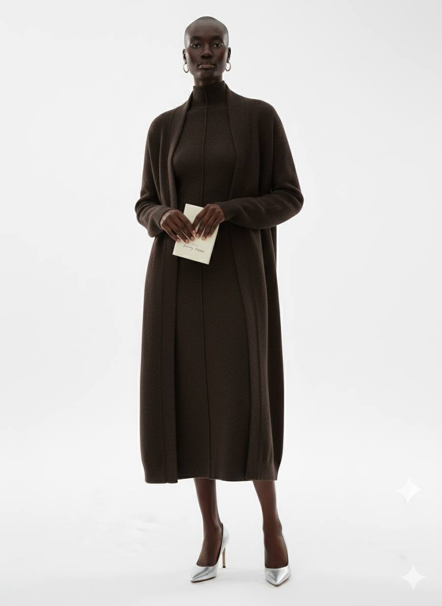 Achieve seamless, elevated elegance with the Monochromatic Minimalist Knit Set, a two-piece ensemble designed for sophisticated warmth and effortless style. Crafted from a soft, insulating wool-blend knit in a rich charcoal grey, this set features a sleek maxi dress and a flowing, oversized shawl-collar coat. Perfect for versatile dressing in the cold, this set combines cozy comfort with a refined, contemporary, and incredibly chic aesthetic.