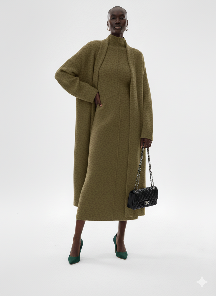 Meticulously knit from a premium, soft wool and synthetic blend (or similar high-quality knit), this set provides superior warmth and a luxurious, substantial drape. The knit is medium-to-heavy gauge, ensuring excellent insulation without feeling stiff. The dress features a mock or full turtleneck for extra warmth, while the coat is typically unlined and features a simple, open-front design. The construction focuses on high-quality seaming and the fluid nature of the fabric, embodying fine, durable knitwear craftsmanship.