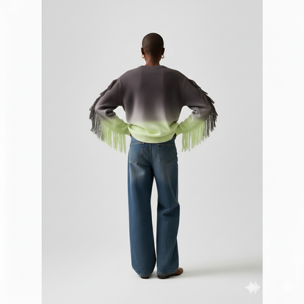 This sweater features a classic oversized, slouchy silhouette with a crew neck, defined by its captivating aesthetic elements. The body showcases a dramatic vertical ombre color transition, shifting seamlessly from a deep charcoal grey or brown at the top to a vibrant neon lime green at the hem. The most distinctive feature is the cascading, multi-layered fringe detailing running down the entire length of the sleeves, adding fantastic movement and an undeniable bohemian-punk edge. The rib-knit cuffs and hem provide a neat, structured finish to the relaxed fit.