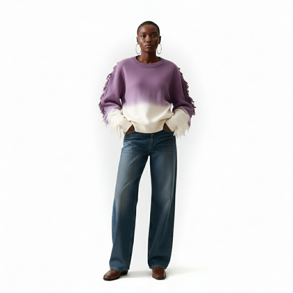 Meticulously knit from a soft, medium-gauge acrylic or cotton blend, this sweater offers excellent comfort and warmth for transitional weather. The fabric has a smooth texture, allowing the bold color dip to stand out. The fringe is integrated directly into the sleeve seams, ensuring a durable and dramatic cascade that moves with you. It features a simple, classic pull-over design, emphasizing the artistry of the ombre dye and the sleeve detailing. The quality knitting ensures a structure that holds its oversized shape while remaining fluid.