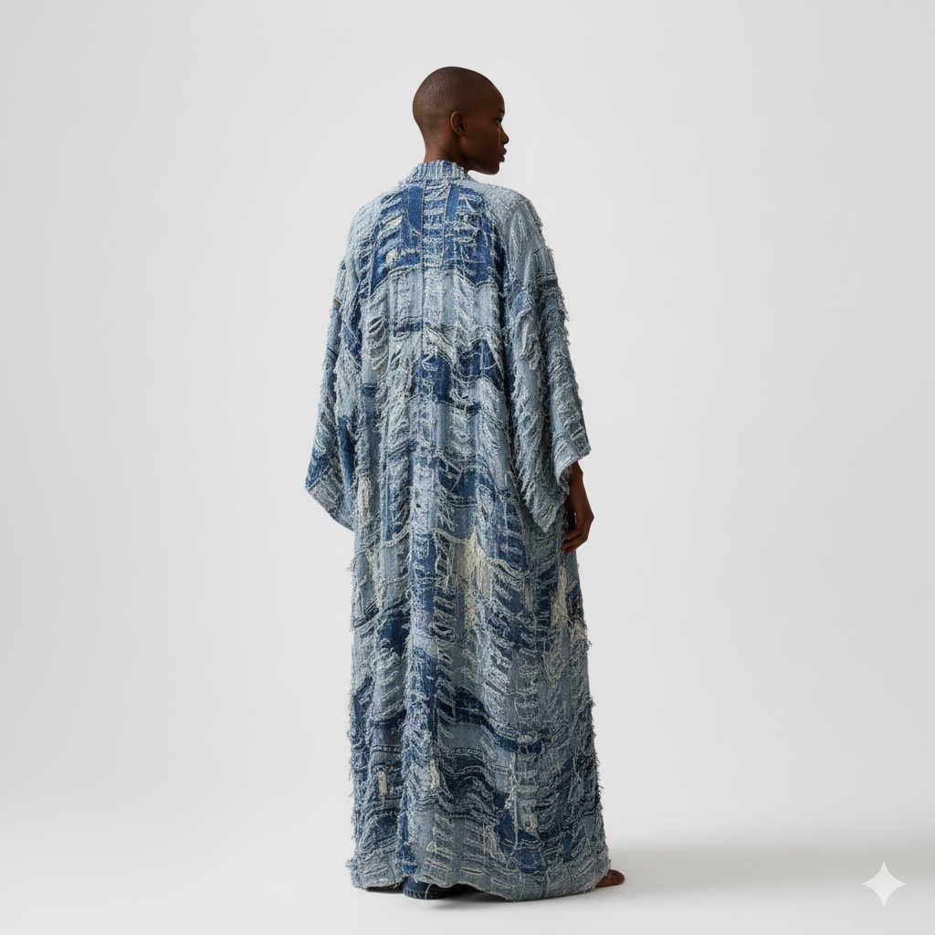 This coat features a statement longline kimono silhouette with a relaxed, open-front design and wide, three-quarter sleeves. Its signature appeal lies in the texture: the entire garment is crafted from medium-wash blue denim that has been heavily distressed, shredded, and finished with continuous tassel fringing along every seam and edge. This dense, shaggy texture creates a dynamic, fluid effect, making the coat move like a textile work of art. The generous cut ensures an effortlessly cool drape, perfect for layering over fitted pieces.